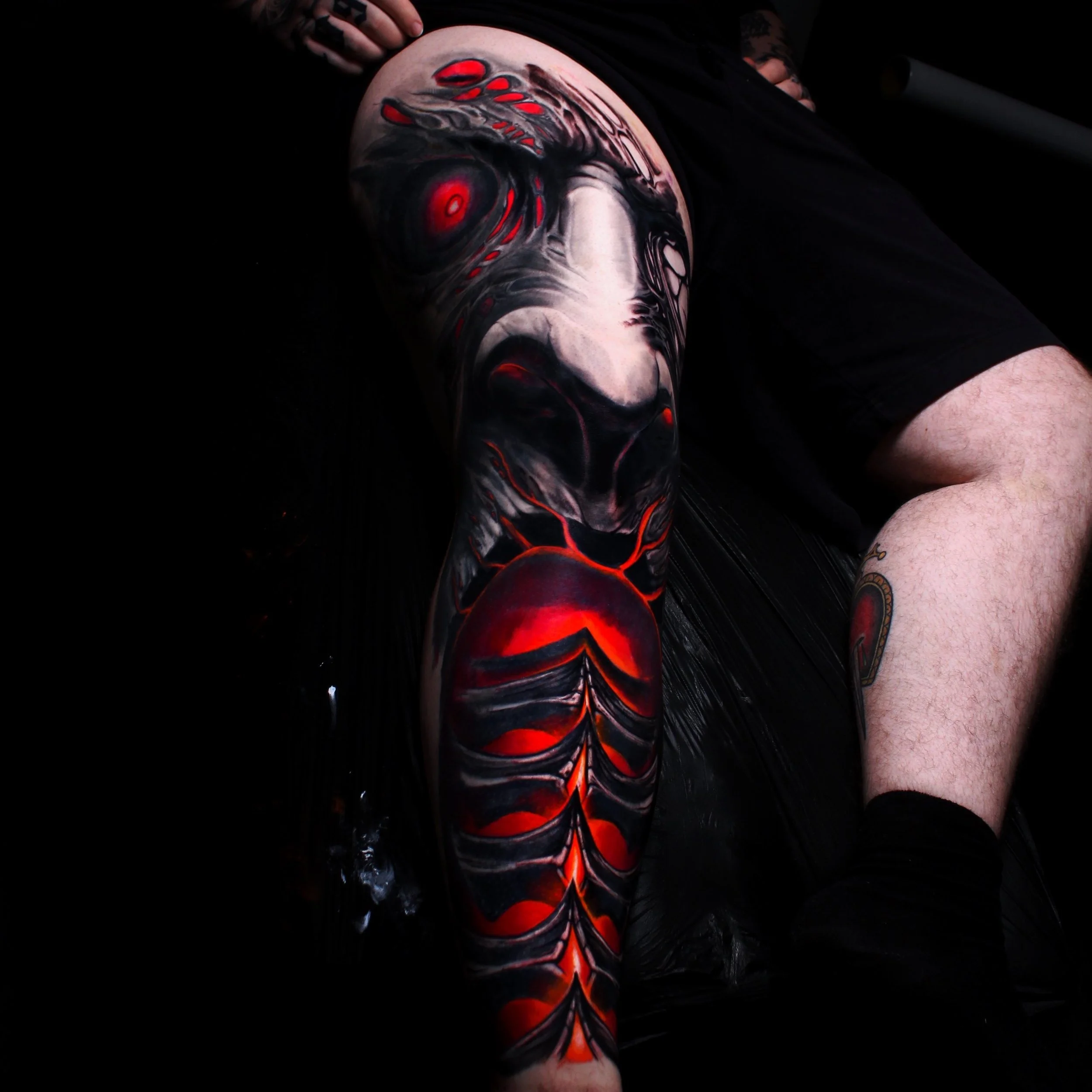 Dark realism tattoo of an angel and a skull done on a lower leg
