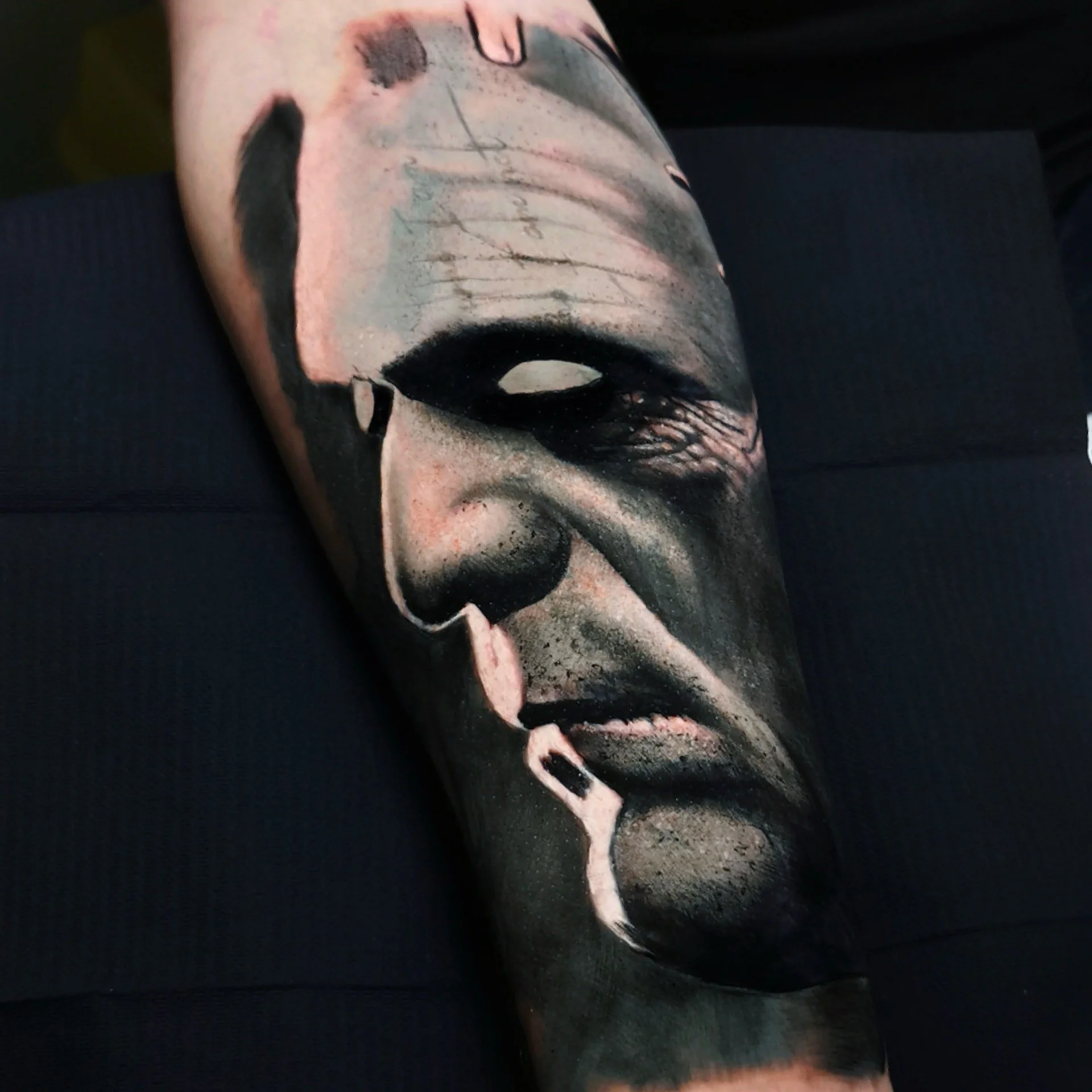 Dark realism tattoo of Marcus Aurelius on an upper arm